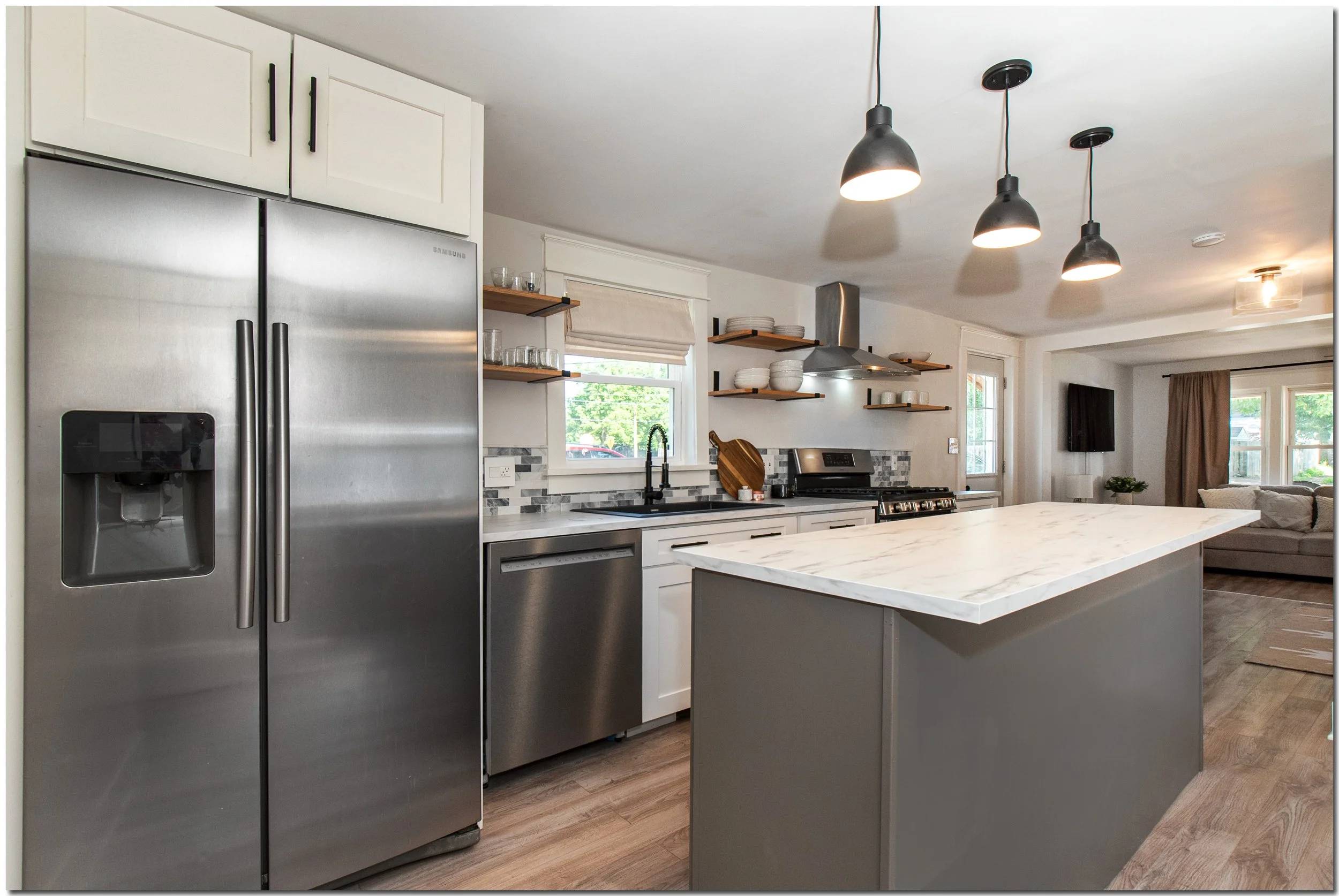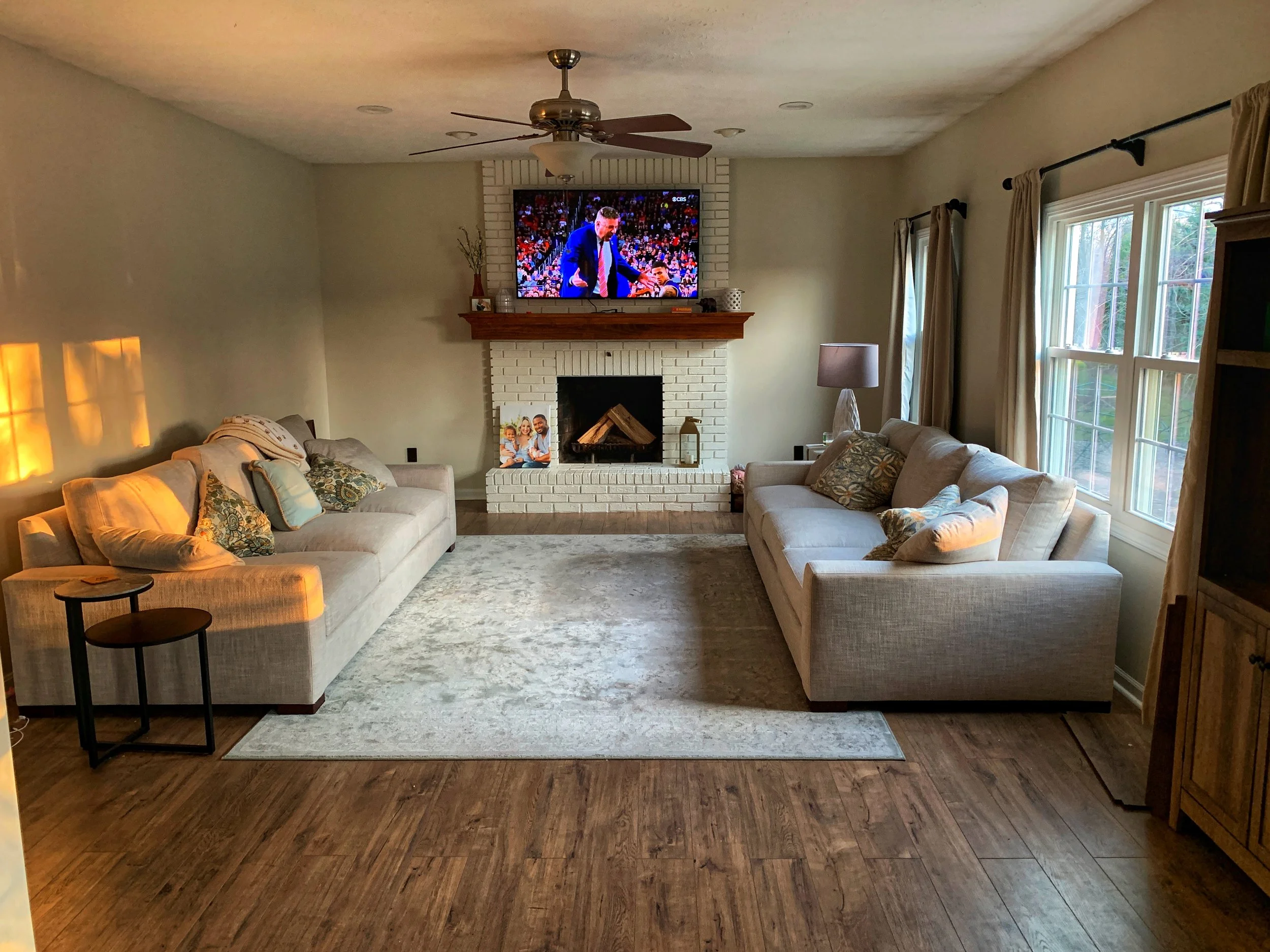 The living room is where families gather and memories inside the home. This living room needed to be brightened up and brought into the 2020s to make it more warm and inviting. Fresh paint, new flooring, and a white-washed fireplace really changed the overall feel of this living room!